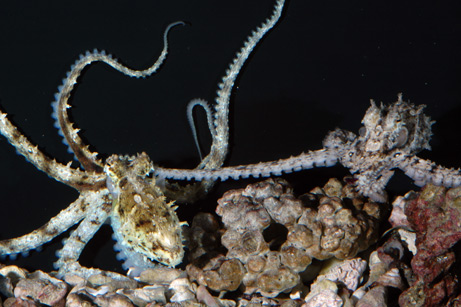 “A male octopus (right) deposits a sperm packet into a female in this photo taken during a field study and released on Monday.”