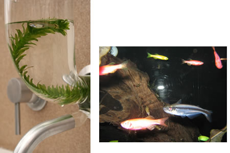 Coal miners used to carry canaries with them down into the mines as a sort of warning device of bad air quality. Because canaries are so much smaller than humans, they would die from breathing the toxic air way before the miners were in any danger. That served as inspiration for artist “Marei Wollesrsberger”:http://marei.co.uk/ whose “BioSafe Habitat”:http://www.we-make-money-not-art.com/archives/009608.php concept involves aquatic plants or fish serving the canaries sacrificial function. In reading about the project, I discovered a fascinating (and patented) species of fish called “GloFish”:http://en.wikipedia.org/wiki/GloFish. These modified zebrafish literally glow when exposed to water contaminants. They’re also the only genetically modified organism to be legally sold as a pet.