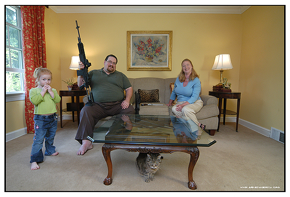 The thing that really surprised me is how very normally-American all these people look. Often pictured with their little children or pets in suburban living rooms, these are no gun nuts. And yet, for a lot of the subjects, toting an assault rifle looks just as natural as a TV remote.
