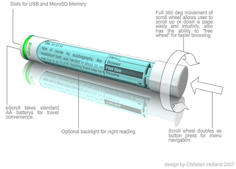 In case you somehow missed it, I love eBooks. I love eBooks so much that I can’t stand their clunky design and unimaginative interfaces. Also I’m not so happy about their high price range but this design from Christian Holland has rocked my eBook-loving soul to its core. I love this thing and really want someone to make it a reality. You can find it and other lesser entries in this “submission forum”:http://boards.core77.com/viewtopic.php?t=14530&postdays=0&postorder=asc&start=0 from design site “Core77”:http://core77.com/.