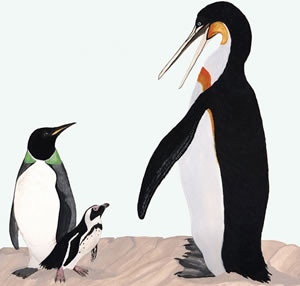 According to the Discovery Channel “website”:http://dsc.discovery.com/news/2007/06/25/giantpenguin_ani.html?category=animals&guid=20070625120000&dcitc=w19-502-ak-0000, there has been new evidence found in Peru that 5 ft tall “super-penguins” lived there over 32 million years ago. These human-sized aquatic birds apparently had very large beaks and less paddle-like flippers than modern species of penguin. The above picture shows these newly discovered penguins next to today’s Emperor and Magellanic penguins.