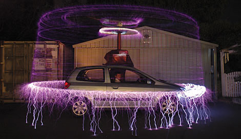 The above photo was taken by Terren of he and his son sitting in his Hyundai under a homemade 5-kilowatt Tesla Coil. The car and its jolting accessory are profiled “here”:http://spectrum.ieee.org/may07/5053