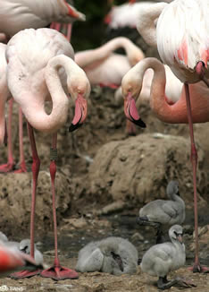 After years of stealing eggs from the neighbors Carlos and Fernando, the only gay flamingo couple at the Wildfowl and Wetlands Trust in Gloucestershire, England, have a chick of the their own. The newly-hatched flamingling was abandoned by its biological parents and so was a logical choice for the gay flamingo couple who have been together for 6 years. I know this sounds like anthropomorphizing, but homosexuality has been observed in a number of species, including penguins, humans, sheep, dolphins, orangutans, beetles, bats and humans. Here’s a picture of the new family, for a larger version and the full story you can read “The Daily Mail”:http://www.dailymail.co.uk/pages/live/articles/news/news.html?in_article_id=456716&in_page_id=1770.