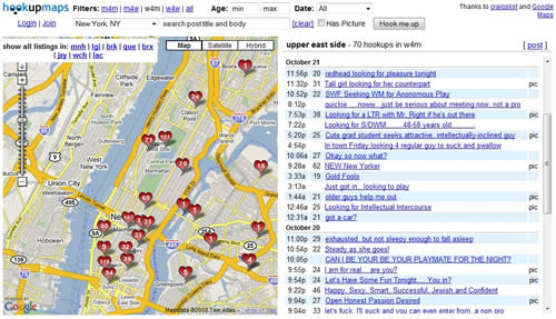 “Hookupmaps”:http://hookupmaps.com/ is a new Google Maps mashup that combines a familiar and easy to use mapping interface with the Craigslist personals section. Unlike most mashups which just add mapping to an existing feature set, hookupmaps actually makes it easier to respond to ads with a built-in response form that kicks the hell out of the arcane Craigslist UI.