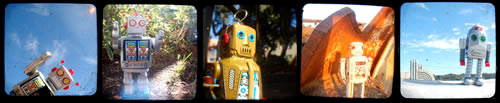 It’s a miracle how social networking can lead to such wonderful treasures as those killer robot pictures above. I followed a link trail from one of my “Last.fm”:http://last.fm neighbours and somehow ended up at “LeSophie’s Flickr stream”:http://flickr.com/photos/25168809@N00/. The highlight of the stream was this “set”:http://flickr.com/photos/25168809@N00/sets/72157600033291647/ featuring retro robot pictures taken with a digital SLR through an old Kodak Dualflex camera viewfinder. That’s why each of these super-sweet robot pictures lies within that retro-looking frame and has a grain to it.