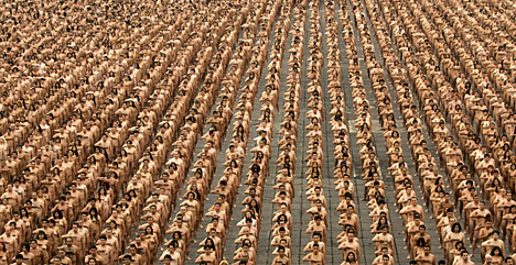 17 to 18 thousand people turned out in Mexico City the other day to take their kit off and pose for the world’s largest nude photo shoot. The photographer, Spencer Tunick, had previously taken similar pictures in Barcelona with 7,000 people posing. The throng posed in a number of configurations including this one with the entire naked crowd saluting the Mexican flag.