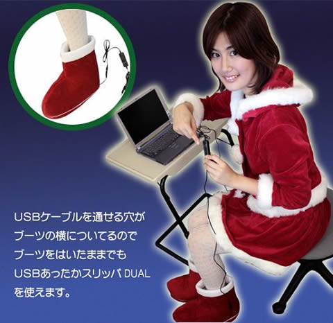 After “USB genitals”:http://gizmodo.com/gadgets/gadgets/teledildonics-virtual-hole-and-stick-a-small-step-not-giant-leap-228948.php, this seems like the next strangest computer peripheral. These red “Santa-like booties”:http://geeksugar.com/867852 plug into a spare USB port on your PC and keep your feet warm while you surf. Is it overkill? Yes. Will people buy them? Probably. Should anyone ever think about these again? No.